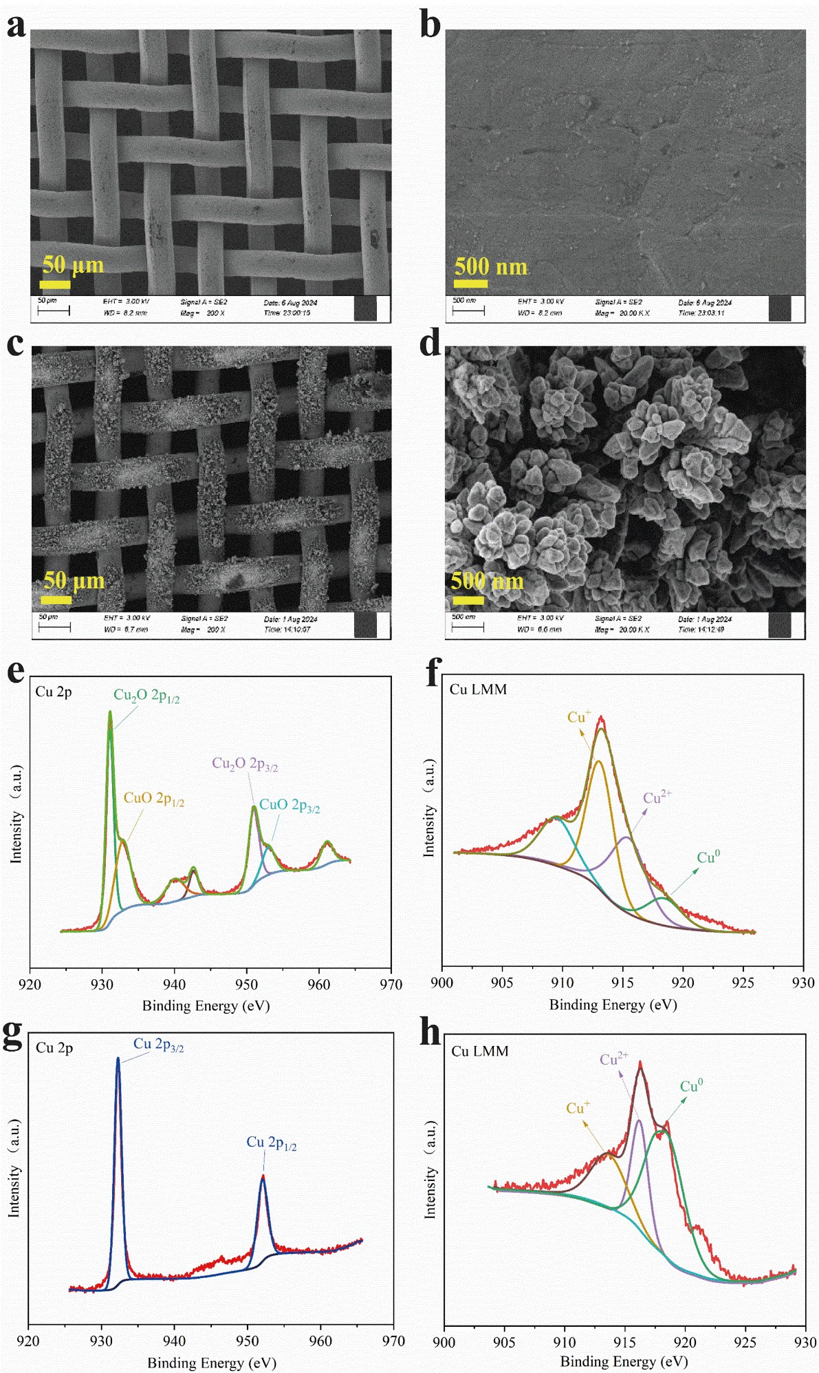 图2.铜网基膜CMo(a, b)和电化学沉积膜CMe(c, d)的形貌图。电沉积膜在应用–20 V还原电压前(e, f)和后(g, h)的XPS图谱。
