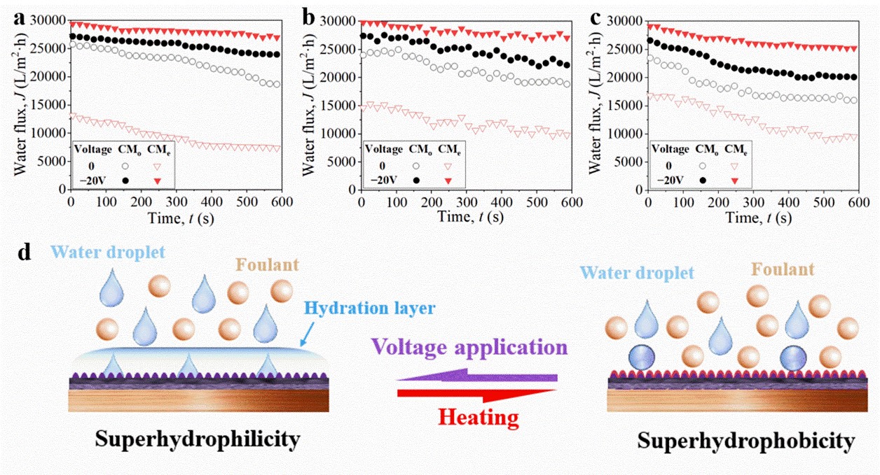 图4.智能膜过滤(a)地表水、(b)含藻水和(c)微塑料水的通量变化情况;(d)超亲水和超疏水膜的抗污染行为。