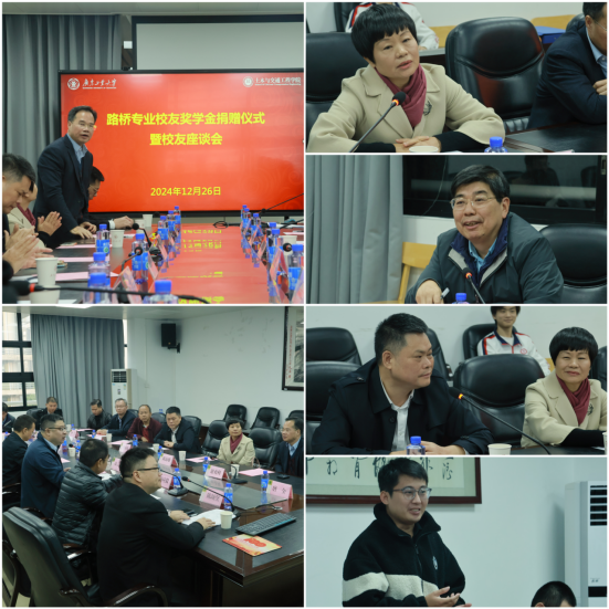 路桥专业校友奖学金捐赠仪式暨校友座谈会在实验二号楼502举行。学院党委书记周建强、学院院长赵志伟、学院校友分会会长刘集纯、学院校友分会常务副会长、轮值会长冯应毅、路桥专业84、85级校友代表、教师代表、学生代表出席活动,仪式由学院党委副书记陈颂坚主持。
