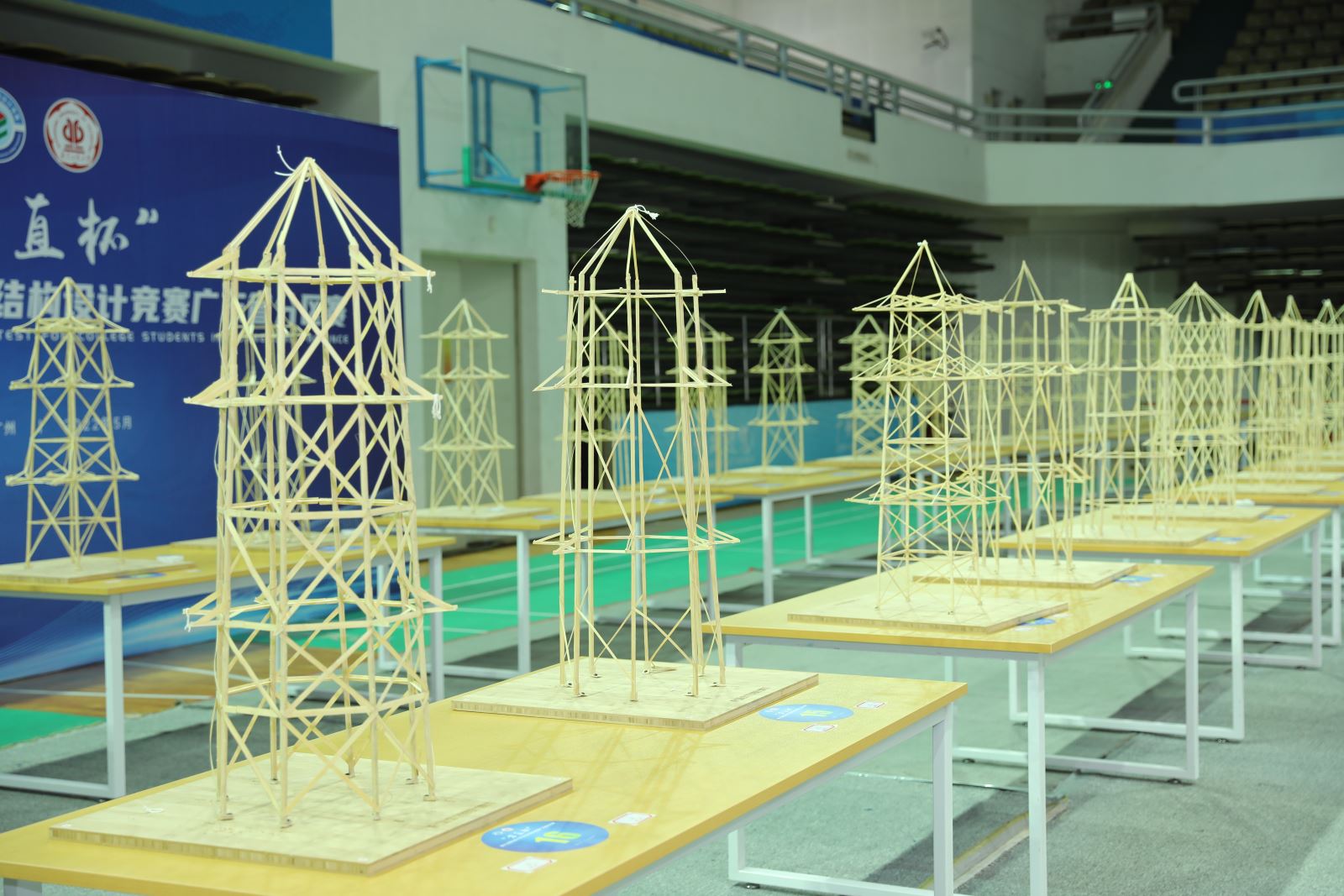 本次竞赛以山西应县木塔为原型,以三重木塔结构为题,要求参赛队伍在现场用美工刀、钢尺、三角板、胶水等工具,利用组委会提供的竹条和竹片经过16个小时造出一座本身质量轻盈且能够承受受力要求的,带挑檐加载点的木塔结构,充分考察学生的理论知识储备、空间受力分析能力、创新能力和工程实践能力。