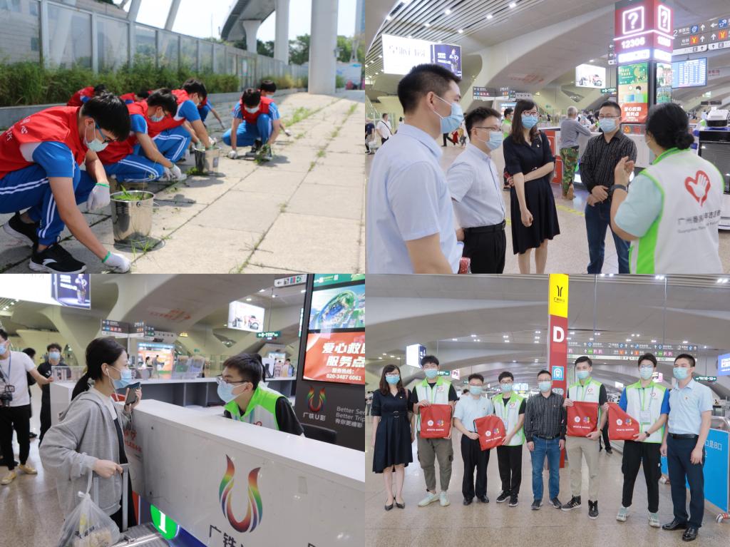 启动仪式结束后,志愿者们身体力行,前往西广场南侧开展除草活动。校地双方领导来到南站大楼慰问已经上岗的我校志愿者代表,提醒他们做好防护措施,严格按照志愿者服务及行为规范,用微笑服务展现广工学子的青春风采。