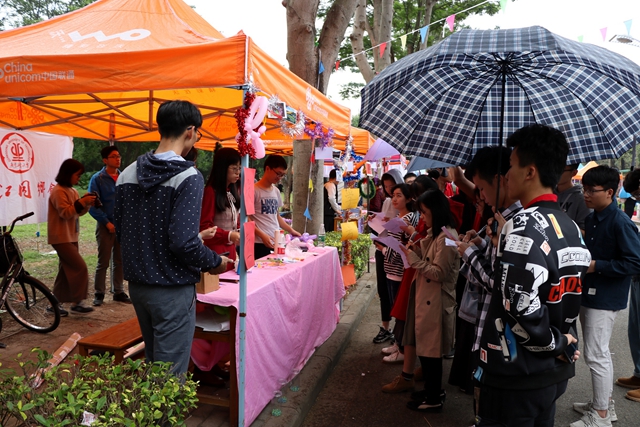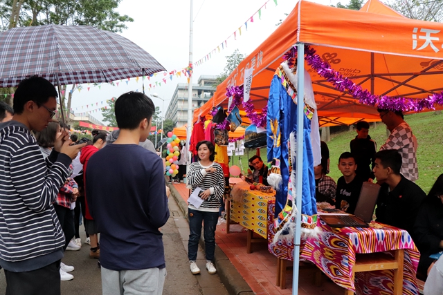 下午,天空飘起了小雨,但是这并没有影响人们的热情,络绎不绝的观众,此起彼伏的欢笑声,以及来自新疆、西藏少数民族学生的歌舞,在朦胧的小雨中尽显热闹欢快。