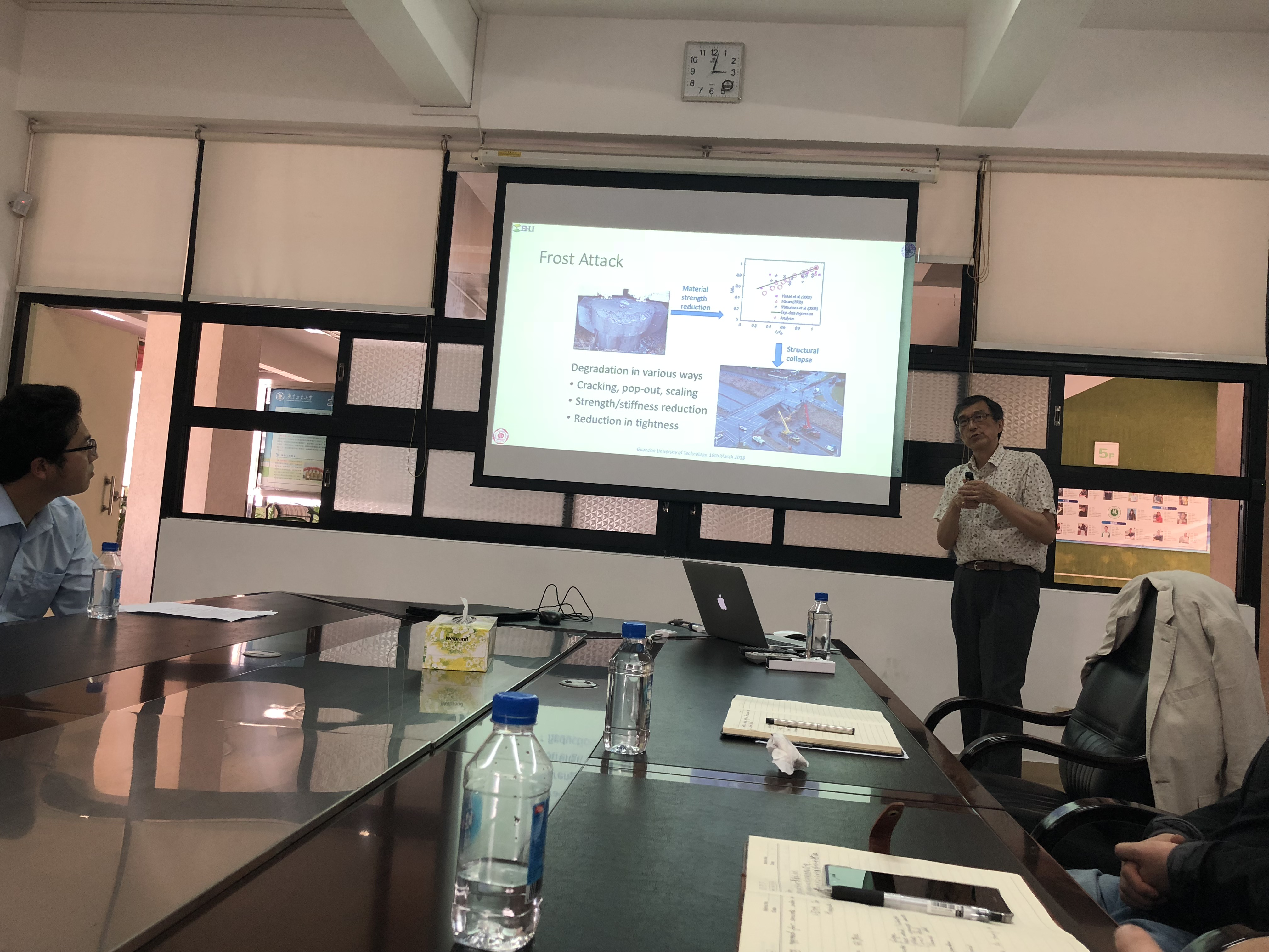 报告会上,上田教授深入浅出地讲解了多种混凝土性能劣化问题的本质(如疲劳、盐害/碳化、碱骨料反应、冻害等)以及如何结合水分离子运移模型和力学模型用细观尺度统一建模方法模拟混凝土不同物理损伤。并详细介绍了模拟混凝土冻害和疲劳复合作用的研究成果及待解决关键科学问题。