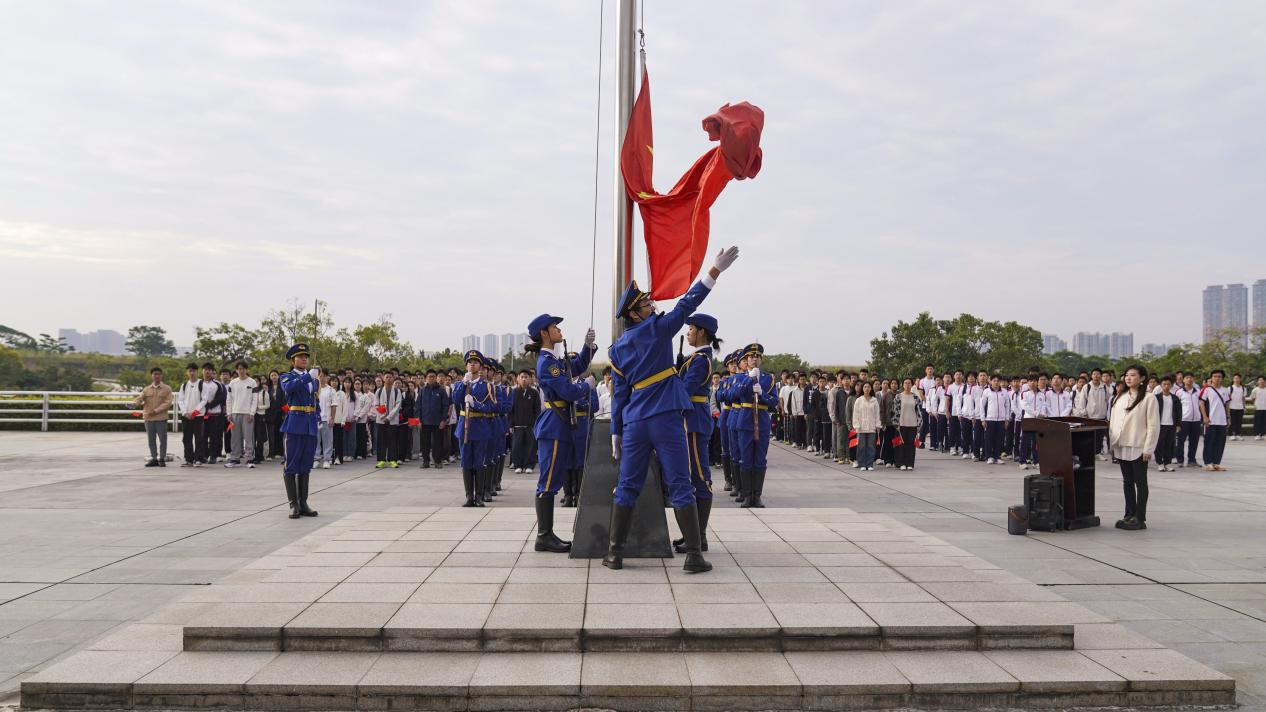 伴随着雄壮激昂的《中华人民共和国国歌》,五星红旗冉冉升起,迎风飘扬。全体师生肃立行注目礼,目光中饱含着对祖国的无限热爱与崇高敬意,现场气氛庄重而肃穆。