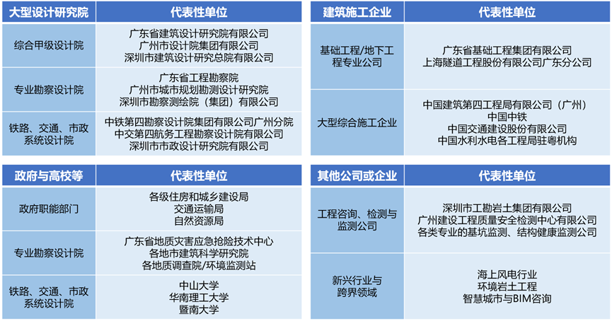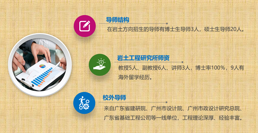 另外在广东省建研院、广州市设计院、广州市政设计研究总院、广东省基础工程公司、东莞市建筑科学研究院、广州盾建建设有限公司等一线科研、设计及施工单位聘有工程理论深厚、经验丰富的校外导师20余名