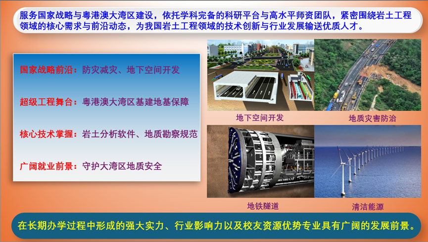 作为服务国家战略与粤港澳大湾区建设的关键学科方向,岩土工程硕士点依托学科完备的科研平台与高水平师资团队,紧密围绕岩土工程领域的核心需求与前沿动态。我们致力于培养拥有扎实的岩土力学理论基础出色的工程实践与解决复杂问题能力,并具备强烈创新思维的高层次专门人才,在岩土体稳定性分析与加固、地基处理与基础工程、地下空间开发与利用、岩土工程灾害防控(如滑坡、基坑变形)、环境岩土工程及智慧岩土监测等前沿领域持续深耕,为我国岩土工程领域的技术创新与行业发展输送优质人才。